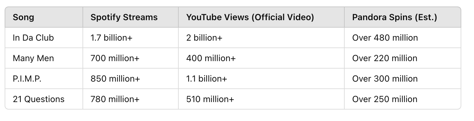 Notably, "In Da Club" is now one of the most-licensed hip-hop songs of all time, demonstrating that cultural ubiquity can drive long-tail sync revenue.
